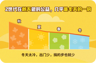 值得一提的是,Z世代參與公益行為的次數,秋天幾乎是冬天的一倍。秋高氣爽更適宜線下公益活動的舉辦,好的天氣也更能激發年輕人捐步的行為。