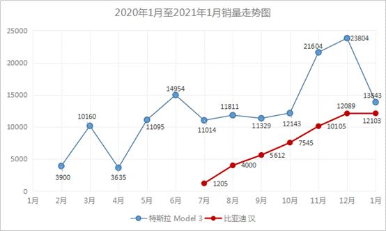 有觀點(diǎn)認(rèn)為,Model 3多次下調(diào)售價(jià)一方面是自身國(guó)產(chǎn)化帶來(lái)的成本降低,另一方面是比亞迪漢熱銷給其帶來(lái)的巨大市場(chǎng)壓力。2020年7月,漢上市首月,Model 3月銷較6月下降近30%;2021年1月,漢穩(wěn)步熱銷,Model 3銷量環(huán)比出現(xiàn)更大幅度的下滑。