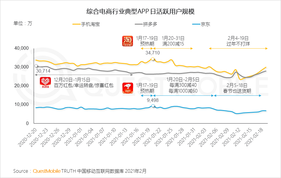 ▲QuestMobile數據顯示,大年初一和初二(2月12日和2月13日)兩天,拼多多APP的日活躍用戶數(DAU)登頂行業第一。