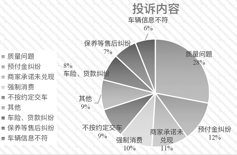 上述投訴中,涉及質(zhì)量問(wèn)題的投訴數(shù)量最多,達(dá)到1190宗,占投訴總量的28%;車(chē)輛信息不符的投訴273宗,占投訴總量的6%;預(yù)付金定金等糾紛515宗,占投訴總量的12%;不按約定交車(chē)的投訴386宗,占投訴總量9%;質(zhì)保保養(yǎng)等售后投訴309宗,占投訴總量的7%;商家承諾未兌現(xiàn)的投訴448宗,占投訴總量11%;車(chē)險(xiǎn)、貸款投訴321宗,占投訴總量8%;強(qiáng)制消費(fèi)投訴412宗,占投訴總量10%;其他投訴386宗,占投訴總量9%。