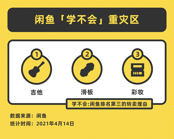 除了留不住的心頭好,還有搞不定的新才藝。“學不會”也是閑魚上熱門的轉賣理由,中國人到底啥“學不會”?閑魚數據顯示,吉他、滑板、彩妝是“學不會”的重災區。此前,知名脫口秀演員小鹿就曾說:“閑魚的商品列表,是破碎夢想的火葬場。”