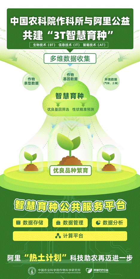 2021年6月8日,由中國農(nóng)業(yè)科學院作物科學研究所與阿里巴巴公益基金會牽頭,會同北京中國農(nóng)業(yè)科學院農(nóng)業(yè)發(fā)展基金會、阿里巴巴達摩院達成合作,共同推動建立生物技術(BT)、信息技術(IT)與智能技術(AT)的深度融合的“智慧育種”平臺,為加快培育作物新品種提供重要技術支撐。此外,雙方還將一起打造和培養(yǎng)一支專業(yè)化的智慧育種人才隊伍。