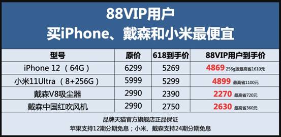 在小米的天貓旗艦店,用88VIP消費券買小米11 Ultra,最高能省1100元,小米11 Ultra到手價低至4899元;此外,蘋果官方旗艦店也火力全開,不僅支持每滿200-20元,還可以使用88VIP優惠券,iPhone 12到手價低至4869元。