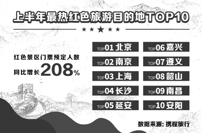 今年紅色旅游熱潮不斷升溫。攜程報告顯示,上半年通過攜程預訂紅色景區門票的人數同比增長208%,較2019年度上半年實現增長達35%。