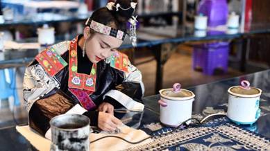 【圖說:“天才媽媽”公益項目支持下,丹賽蠟染傳承人王欣穎獲得了全新的發(fā)展機會】