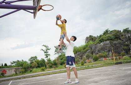 【圖說:“大山里的籃球夢”公益項目,支教志愿者與鄉(xiāng)村孩子一起打籃球】