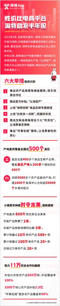 半年以來,淘特通過推出免傭金服務(wù),上線“淘特優(yōu)鮮”食品生鮮專屬頻道和“比拼多一點(diǎn)鮮”、百城百味活動(dòng)等,從全國(guó)挖掘和吸引優(yōu)質(zhì)合作社源頭供給好農(nóng)產(chǎn),目前全國(guó)已有11萬(wàn)產(chǎn)地合作社通過淘特拓展了線上銷售渠道,農(nóng)副產(chǎn)品補(bǔ)貼覆蓋率達(dá)100%。其中,南陽(yáng)土雞蛋供應(yīng)合作社天山牧業(yè)線上化90%以上,在淘特日銷雞蛋百萬(wàn)顆,甘肅民勤蜜瓜一天包銷50畝。