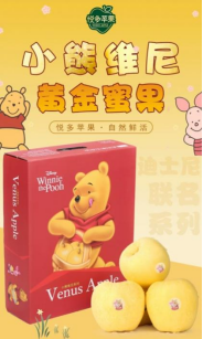 今年,悅多水果又與迪士尼聯動,推出了迪士尼聯名系列。這也是迪士尼首次在農產品蘋果領域的聯名產品。除了消費者熟識的“迪士尼雀斑美人”、“迪士尼版紅富士”外,還有“小熊維尼黃金蜜果”。“維納斯-黃金美人”蘋果的外觀,就跟維尼的蜂蜜罐子一樣,黃澄澄的,看著就甜蜜。