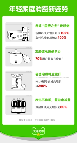 “今年雙11期間,90、95后年輕人正在引領家庭消費中的新趨勢,他們組建起的新家庭,在日常消費上呈現出個性、多元的新特點。”天貓超市相關負責人表示。