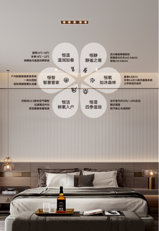 同時作為真·科技住宅,翡麗鉑灣引入恒溫(地源熱泵系統)、恒濕(溫濕調節系統)、恒氧(置換新風系統)、恒靜(系統窗隔音降噪)、恒智(智慧節能控制系統)、恒潔(新風除霾系統)在內的六恒科技住宅,為業主舒適健康生活保駕護航。