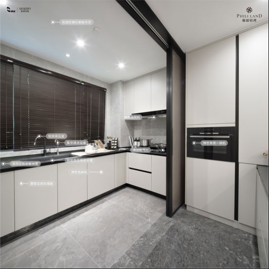 廚房的博世“蒸烤一體機、油煙機、洗碗機、燃氣灶”四件套同時還人性化的增加摩恩垃圾處理器。廚房臺面、玄關臺面,全部嚴苛甄選勞倫金黑色巖板,無主燈懸浮吊頂設計,這是奢華酒店級的觀感。從這些細節可以看出,翡麗鉑灣致力于呈現一個現代豪宅的決心,從構思到執行,從選材到精工,都可以感受滿滿的誠意。