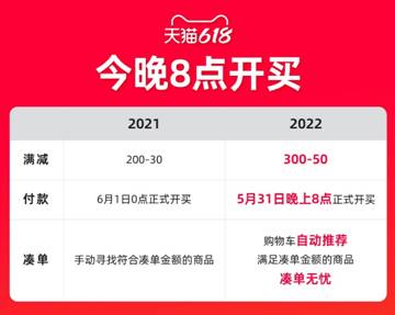 據悉,今年天貓618跨店滿減力度提升至每滿300減50,相當于83折,比去年雙11折扣力度更大。