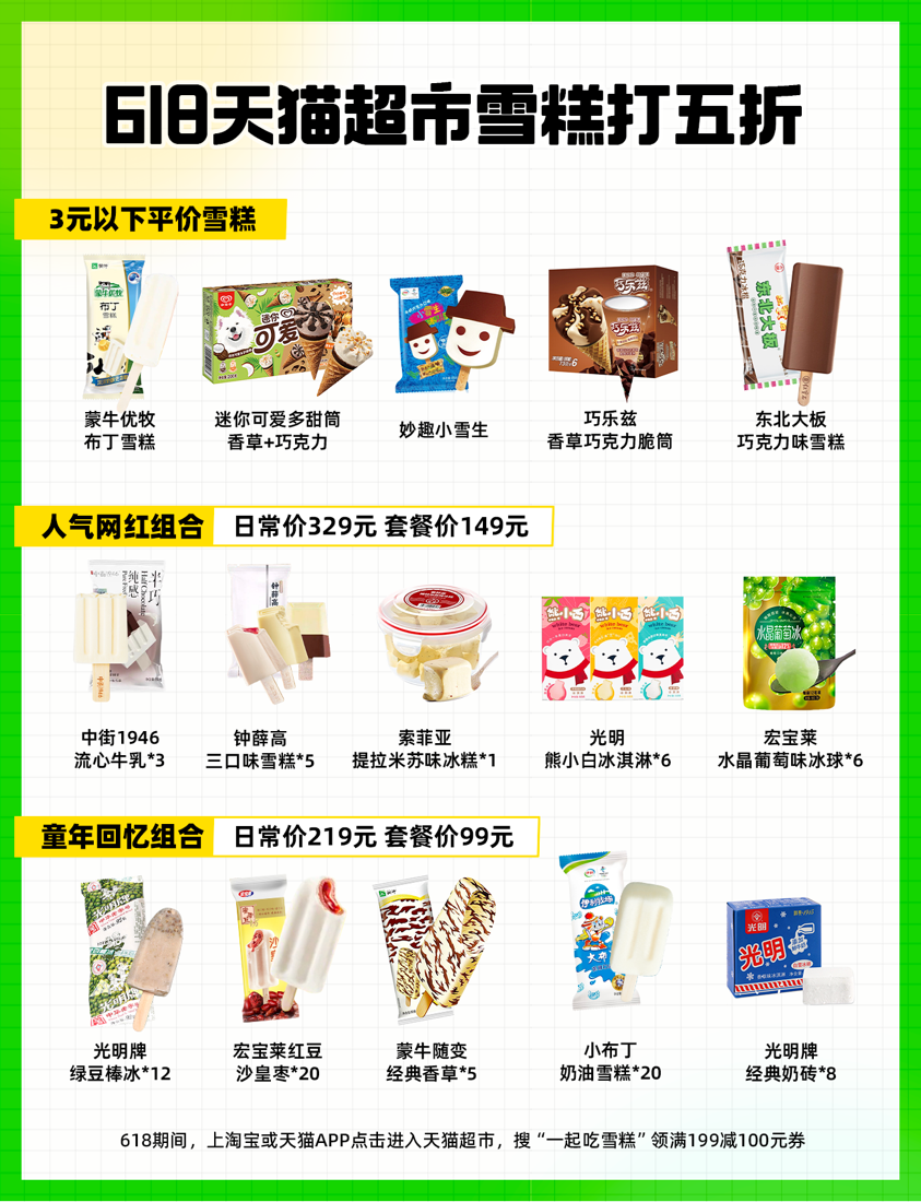 同時,天貓超市還推出一次買齊“童年回憶經典雪糕”,包括了12支光明綠豆棒冰+20支宏寶萊紅豆冰激淋+20支伊利小布丁+8塊光明奶磚+5支蒙牛香草冰激淋,券后到手僅99元。