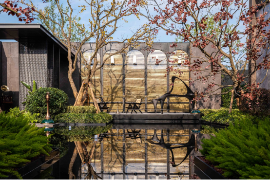 近五米的高墻搭配前廣場臺盆式中央水景,凸顯豪宅氣質。穿過入戶大堂,是戶外會客廳,內設下沉吧臺。