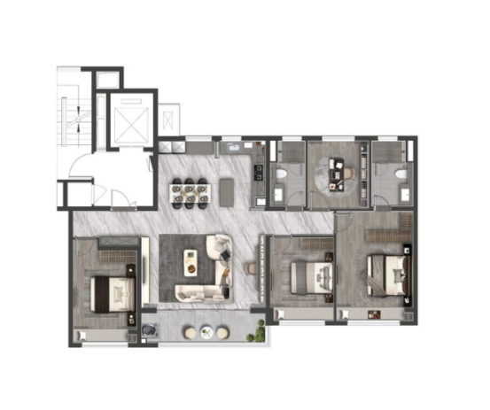 約150㎡戶型擁有近80%的得房率,算上贈送,實際使用率約90%。四開間朝南,南向面寬約15.7米。方廳面寬約5.85米,擁有獨立餐廳;主臥套房設計,步入式衣帽間及獨立衛生間