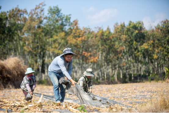 一位名叫“熊杰”的年輕人頭戴草帽、彎著腰,正在一塊收割完玉米的空地上,跟幾位傣族工人一起清理地膜。這是熊杰在曼納龍村種玉米的第二個年頭了。