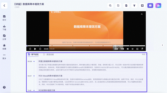 通義聽悟可自動為音視頻生成全文摘要、章節概括、發言總結