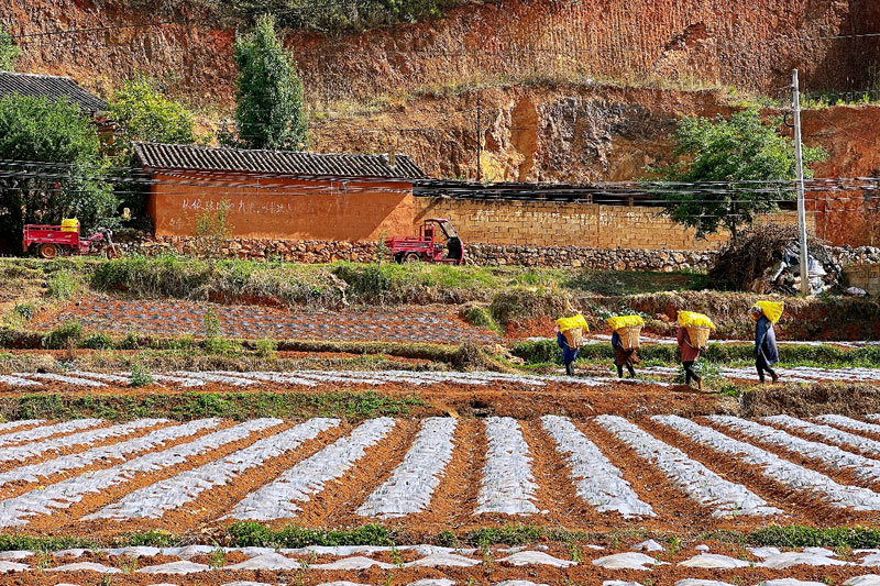 ▲ 臨近傍晚,豐收的洋芋陸續被薯農背上小三輪,即將奔向加工廠。孟云歸▕攝