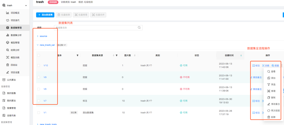 功能包括:數據導入、數據查看、數據編輯、版本管理、數據預處理、數據挖掘、數據標注、數據推理。