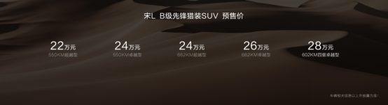 10月31日,今年最值得期待的新車宋L正式開啟預售,發布了5個款型,包括4款后驅版本以及1款四驅版本,預售價格22萬元-28萬元,同時帶來了五重預售權益。