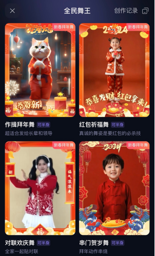 春節前夕,全民舞王推出新春拜年舞模板,涵蓋拜年作揖、要紅包、貼春聯等經典春節舞蹈動作,同時還新增了共舞IP貼紙、情侶拼跳玩法等,用戶可選擇與小龍共舞、與財神共舞,或邀請好友、愛人拼跳等,用「才藝表演」的形式傳遞傳遞喜慶紅火、歡愉溫暖的年味。