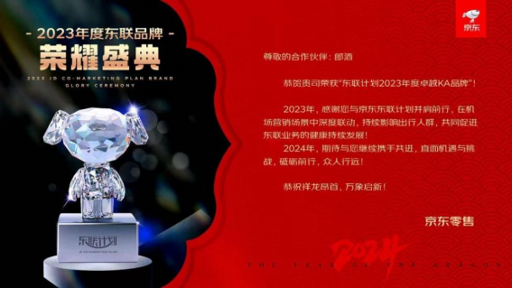 本次“醉美龍年· 郎耀京彩”郎酒京東年貨節可以說是雙方密切合作的一次典型呈現,其成功的基礎,則是長期以來郎酒與京東在聯合營銷及各類場景進行的長期而深度的聯動與合作,實現了用戶人群持續擴大,品牌張力不斷拉升。借此,郎酒在100個KA品牌中脫穎而出,榮獲“東聯計劃2023年度卓越KA品牌”。