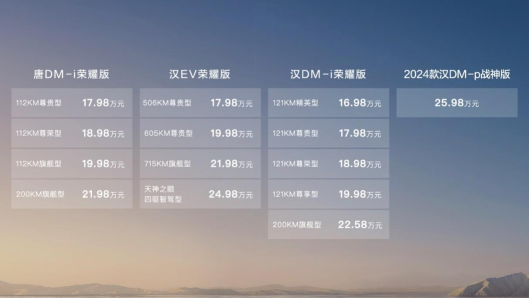 2024年2月28日,比亞迪漢唐榮耀版車型正式上市。其中,漢EV榮耀版共4款車型,售價17.98萬元~24.98萬元;漢DM-i榮耀版共5款車型,售價16.98萬元~22.58萬元;2024款漢DM-p戰(zhàn)神版共1款車型,售價25.98萬元;唐DM-i榮耀版共4款車型,售價17.98萬元~21.98萬元。