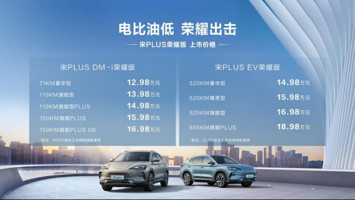 宋PLUS榮耀版DM-i車型售價為12.98萬元-16.98萬元,新增DM-i 71KM豪華型;EV車型售價為14.98萬元-18.98萬元,更具競爭力的售價,為“緊湊型SUV銷冠”續寫榮耀再添新動能。
