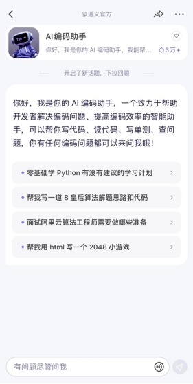 作為國內最歡迎的AI編程工具,通義靈碼下載量已超200萬,它熟練掌握 Java、Python、Go、JavaScript、TypeScript、C/C++、C# 等 200 多種編程語言,可幫助程序員提升超10%的開發效率?,F在,這些能力已在通義千問APP上線。程序員、編程愛好者、學生無需下載專業軟件,使用通義千問就能寫代碼和學代碼。例如,通義千問能幫助程序員在數十秒內生成一個應用代碼,也可以輔助解答經典算法的問題,生成多種解題思路供程序員參考。針對沒有代碼基礎的學生,通義千問可以提供學習建議,例如它可以從理論和實操層面幫助用戶制定一套完整學習Python的計劃。