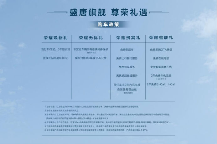 其中,唐EV榮耀版共3款車型,售價21.98萬元-26.98萬元;唐DM-p榮耀版共2款車型,售價22.98萬元-24.98萬元;2024款唐DM-p戰神版共1款車型,售價26.98萬元。同時,比亞迪為用戶準備了包括“2大煥新購車政策、2大無憂用車保障、5大專屬貴賓服務、5大智聯在線服務”的多重榮耀禮遇。