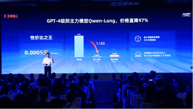 5月21日,阿里云拋出重磅炸彈:通義千問GPT-4級主力模型Qwen-Long,API輸入價格從0.02元/千tokens降至0.0005元/千tokens,直降97%。這意味著,1塊錢可以買200萬tokens,相當于5本《新華字典》的文字量。這款模型最高支持1千萬tokens長文本輸入,降價后約為GPT-4價格的1/400,擊穿全球底價。