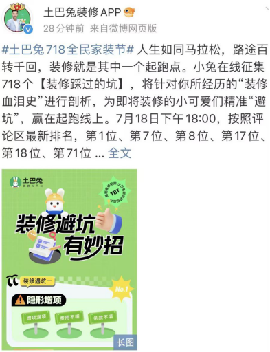活動從7月18日開始,持續至8月18日,為期一個月,用戶可通過土巴兔APP、小程序等渠道即可參與“土巴兔718全民家裝節”。