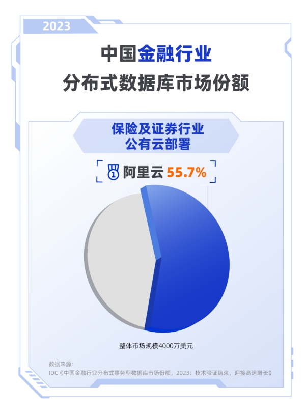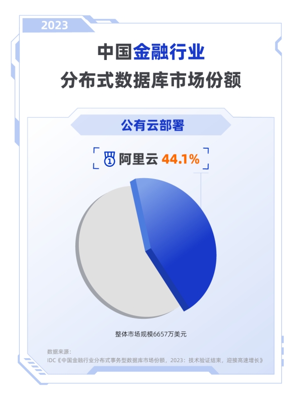 7月30日,記者獲悉,根據IT市場研究和咨詢公司IDC發布的《中國金融行業分布式事務型數據庫市場份額,2023》報告,2023年中國金融行業分布式事務型數據庫市場同比增長12.1%。其中,在公有云部署市場,阿里云市占率44.1%,排名第一;在“保險及證券”子市場中,阿里云同樣斬獲榜首,并以高達55.7%的份額領跑該子市場的公有云部署市場。