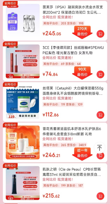 對于消費者而言,領再多的優惠券也不如直接到手的真低價劃算。就比如京東國際推出的“超級美妝節”,打開京東APP搜索“美妝節”,就可以進入活動,里面展示了一系列能夠支持全網比價的美妝護膚和個人護理商品,能讓消費者省下不少心。