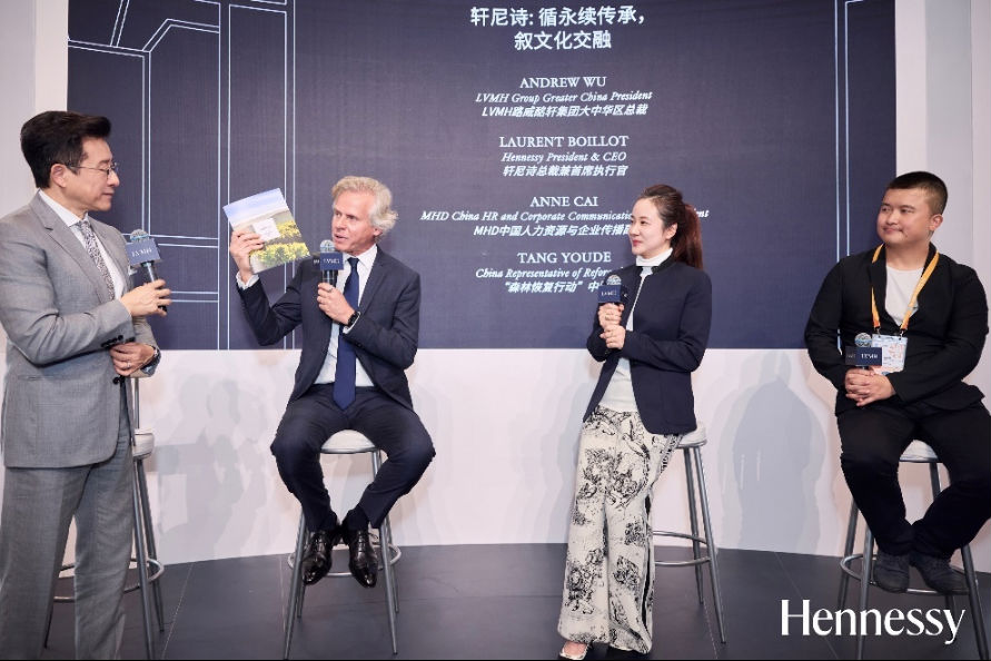 為了進一步探討可持續(xù)的未來耕耘方向,展會現場,LVMH大中華區(qū)總裁吳越先生誠邀軒尼詩總裁兼首席執(zhí)行官Laurent Boillot、酩悅軒尼詩帝亞吉歐中國人力資源與企業(yè)傳播副總裁蔡瑩凌女士和軒尼詩的可持續(xù)合作伙伴之一森林恢復行動(Reforest’ Action)中國代表唐友德,共同發(fā)起了一場以“軒尼詩:循永續(xù)傳承,敘文化交融”為主題的對話。