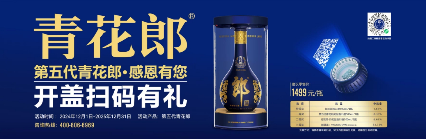 11月30日,青花郎官方公眾號宣布:在2024年12月1日-2025年12月31日期間,購買第五代青花郎并打開瓶蓋掃碼,即可參與抽獎,且綜合中獎率100%。據悉,其中最高獎品為紅運郎500ml裝一瓶。