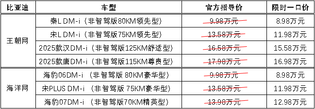 比亞迪王朝網官宣,4款非智駕版熱銷車型,秦L DM-i(非智駕版)限時一口價8.98萬元起,宋L DM-i(非智駕版)限時一口價11.98萬元起,2025款漢DM-i(非智駕版)限時一口價15.58萬元起,2025款唐DM-i(非智駕版)限時一口價16.98萬元起。
