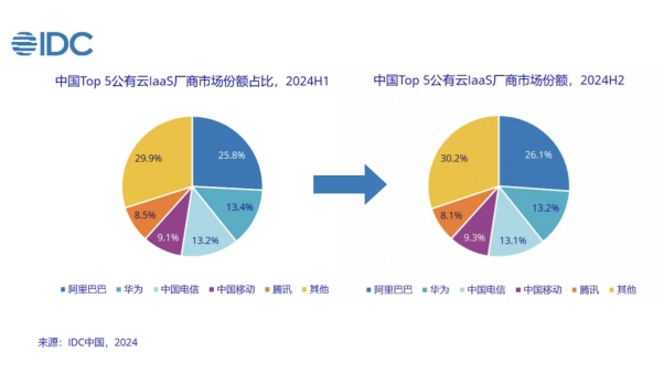 4月30日,IDC發布《中國公有云服務市場(2024下半年)跟蹤》報告,AI推動公有云市場回暖,2024下半年中國公有云IaaS市場規模為948.2億人民幣,同比增長 13.8%。阿里云市場排名第一,份額連續三個季度回升。華為第二、中國電信第三、中國移動第四、騰訊第五。