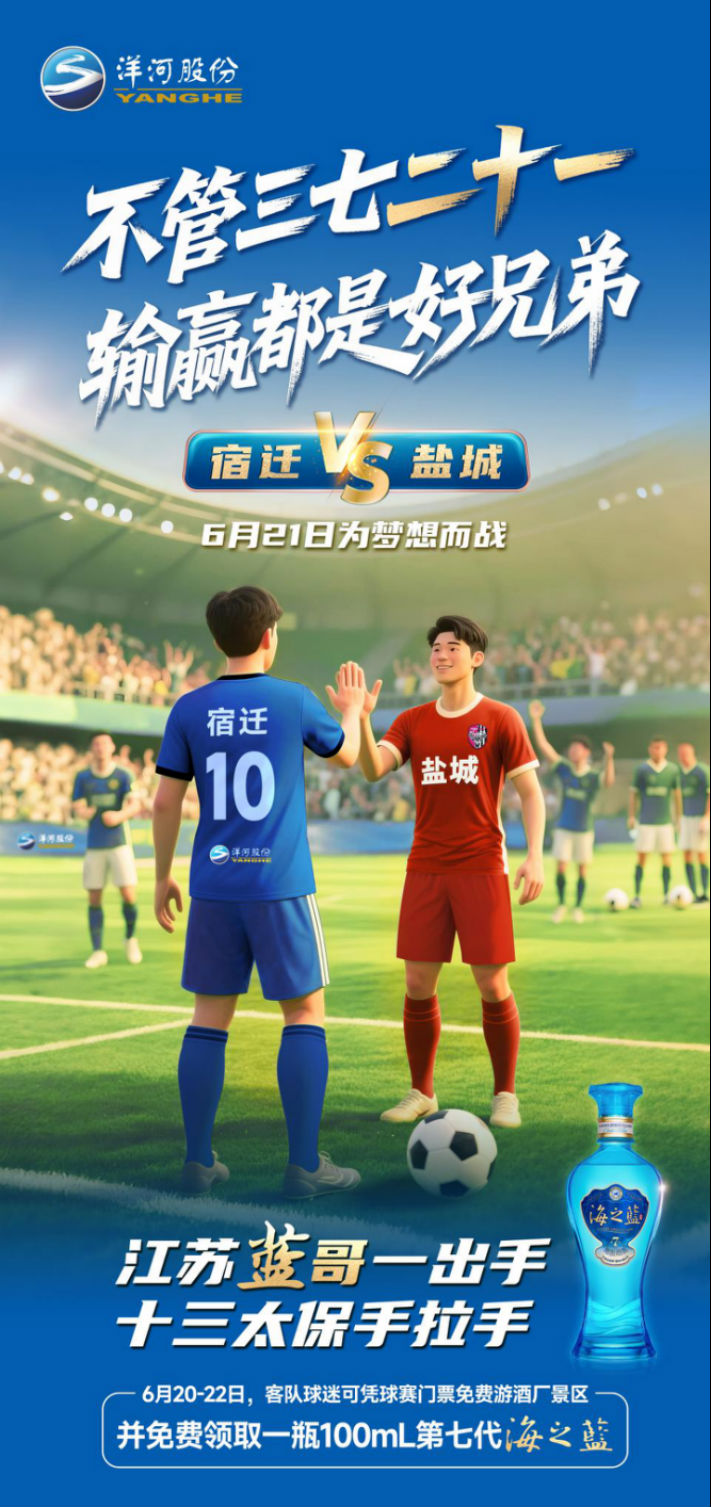 在宿遷主場(chǎng)賽事期間,除了牽手宿遷文旅為球迷提供的各類貼心福利,洋河股份也有自己的“硬核彩蛋”。在6月21日比賽前,洋河股份面向鹽城球迷推出“旅游+贈(zèng)酒”的專屬禮遇,客隊(duì)球迷只需憑身份證,即可免票暢游洋河酒廠及雙溝酒文化旅游區(qū),感受千年釀酒技藝。不僅如此,客隊(duì)球迷們還能憑球票領(lǐng)取100mL裝的第七代海之藍(lán),搶先品嘗體驗(yàn)這款洋河股份全新升級(jí)的經(jīng)典之作。