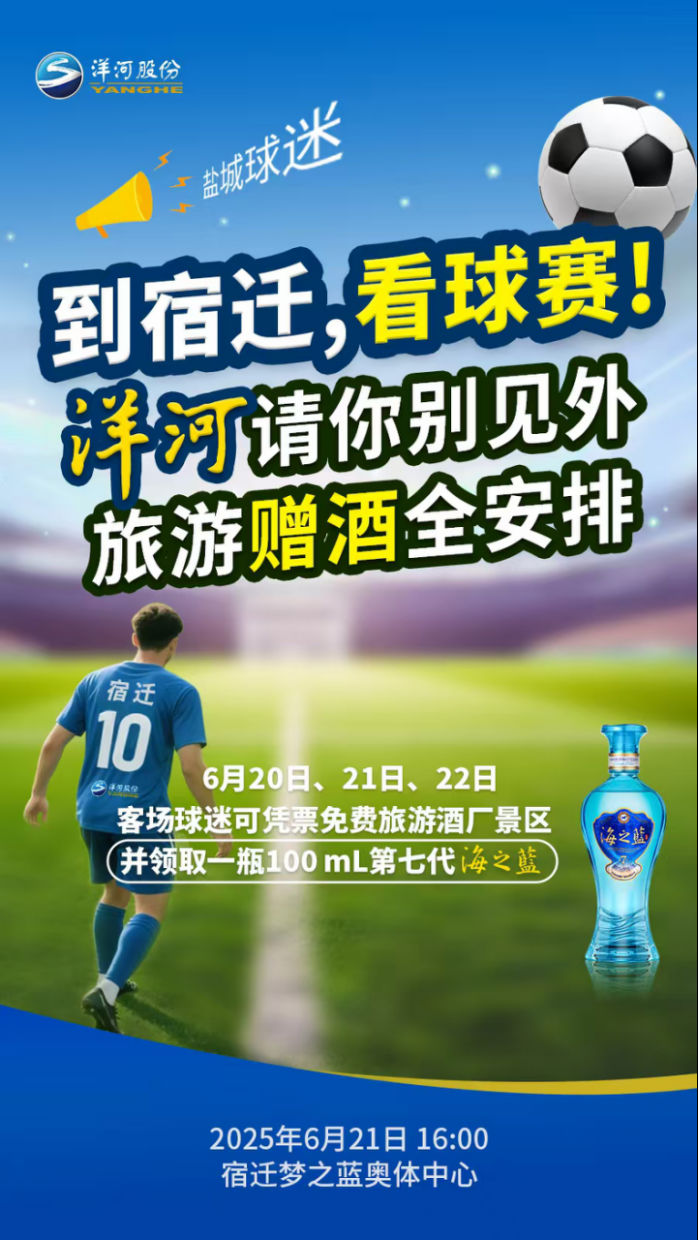 6月21日,蘇超又將鳴哨!“中國(guó)酒都”宿遷的夢(mèng)之藍(lán)·奧體中心將迎來(lái)精彩對(duì)決——宿遷洋河股份隊(duì)主場(chǎng)迎戰(zhàn)鹽城隊(duì)。央視頻App將同步直播本場(chǎng)比賽,這不僅是綠茵場(chǎng)的較量,更是洋河股份以“主場(chǎng)禮遇+福利矩陣”與江蘇球迷共赴足球夢(mèng)想的新起點(diǎn),來(lái)自鹽城的客隊(duì)球迷也將率先解鎖新體驗(yàn)。