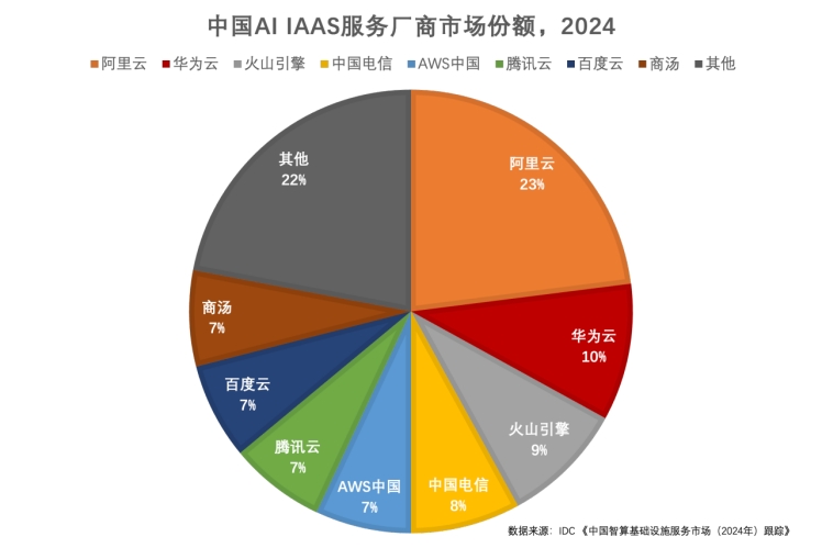 根據(jù)IDC報(bào)告,2024年全年,阿里云 AI IaaS 市場(chǎng)份額達(dá)23%,華為云占比10%,火山引擎占比9%。IDC認(rèn)為,生成式IaaS市場(chǎng)持續(xù)快速迭代,頭部格局加速收斂:目前,阿里云依托云資源規(guī)模優(yōu)勢(shì)和PAI及靈駿產(chǎn)品能力,在大模型訓(xùn)練及大模型推理IaaS市場(chǎng),均位列第一。IDC預(yù)計(jì)頭部公司將繼續(xù)加大算力投入規(guī)模以提升模型通用性能,形成技術(shù)和生態(tài)主導(dǎo)權(quán)。
