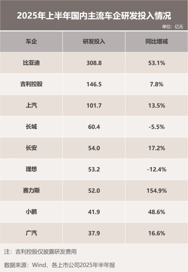 再對比同行,從已經公布2025半年報的國內主流車企來看,吉利控股上半年研發費用為147億元、長城汽車研發投入為60億元、理想為53億元、小鵬為42億元,比亞迪一家的研發投入幾乎等于四家車企之和。