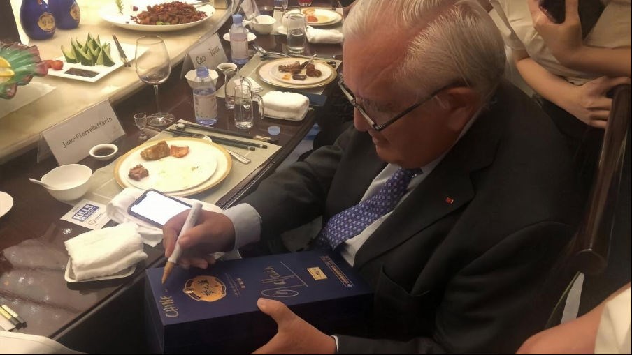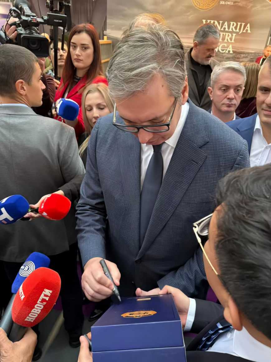 洋河產(chǎn)品獨(dú)特的綿柔口感與符合國際潮流的美學(xué)設(shè)計(jì),吸引了現(xiàn)場眾多嘉賓。展會(huì)期間,塞爾維亞總統(tǒng)武契奇親臨洋河展區(qū),品嘗了夢之藍(lán)后稱贊綿柔口感“pretty good”,并欣然留下了親筆簽名。