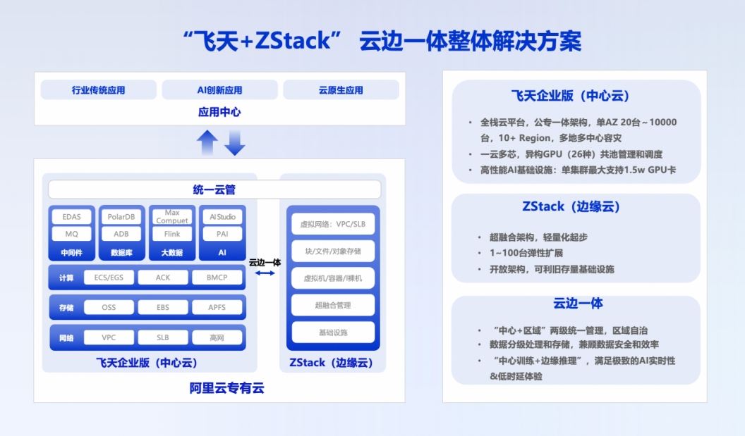 隨著企業數智化轉型步入深水區,不再需要零散的IT系統,而是一套能統一管理、靈活調用的整體解決方案。在這過程中,阿里云與ZStack可以“互補”。阿里云自主研發的飛天企業版支持一云多芯和大規模算力管理調度,擅長處理海量數據和高強度的AI模型訓練;ZStack則以“輕量化、標準化”見長,能夠將強大的計算能力快速搬到企業的辦公樓、工廠甚至基站側。此次合作,雙方共同構建了業界領先的、覆蓋從超大規模數據中心到小型邊緣節點的全棧云基礎設施解決方案,為企業提供了一條從傳統虛擬化架構平滑、高效演進到云平臺的完整路徑,將把強大的計算能力無縫延伸到離業務最近的地方,讓算力像水電一樣隨用隨取。