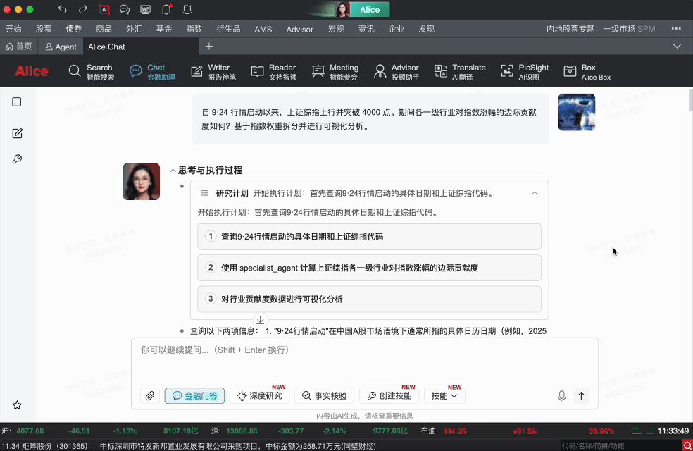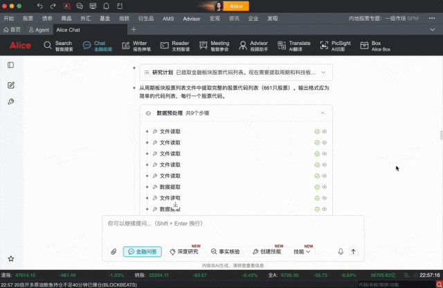 Alice 27 讓投研第一次“化零為整”,“穿戴兵器”,“全副武裝”。它不再停留在數(shù)據(jù)獲取層面,而是直接接管“金融任務”本身。