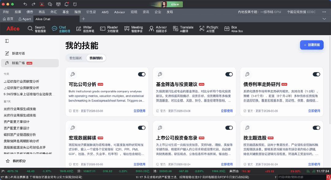 Alice 27 圍繞 40 多類金融專業(yè)角色,打造了幾十種開箱即用的技能,每日等你來解鎖新技能,覆蓋公司研究、行業(yè)分析、估值建模、產(chǎn)品篩選、策略回測、資產(chǎn)配置、組合優(yōu)化、演示匯報等等核心金融工作場景。