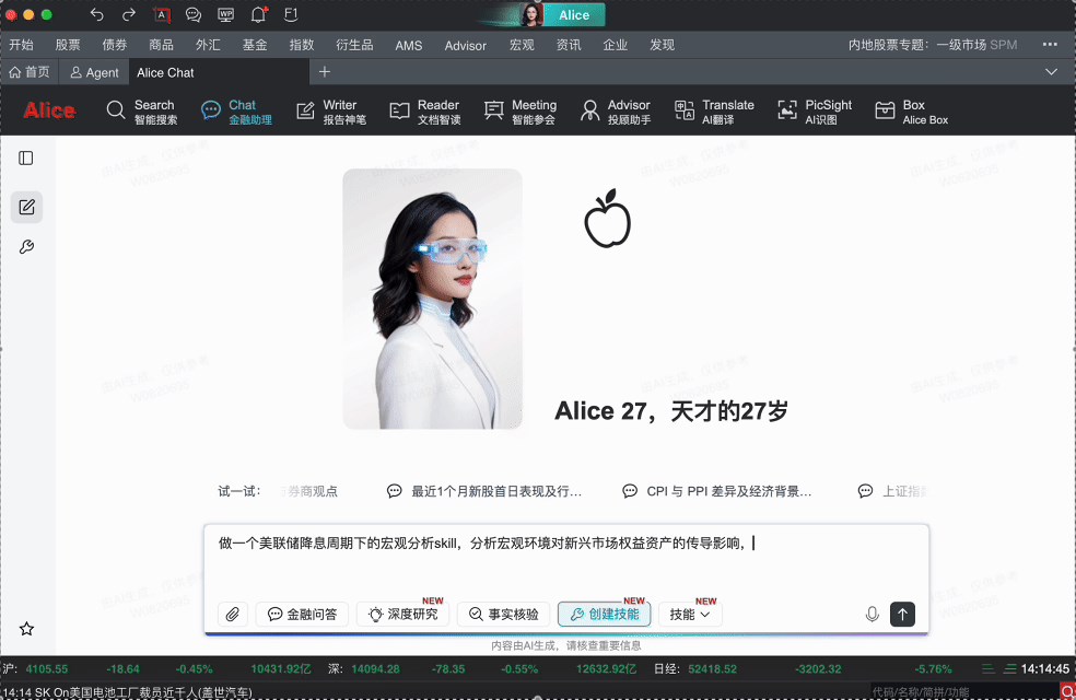 Alice 27,為此而生。有了 Alice 27,你可以擁有一個投研團隊、理財團隊、量化團隊、策略團隊、投行團隊……一個賬號,就是一個全建制的金融團隊。