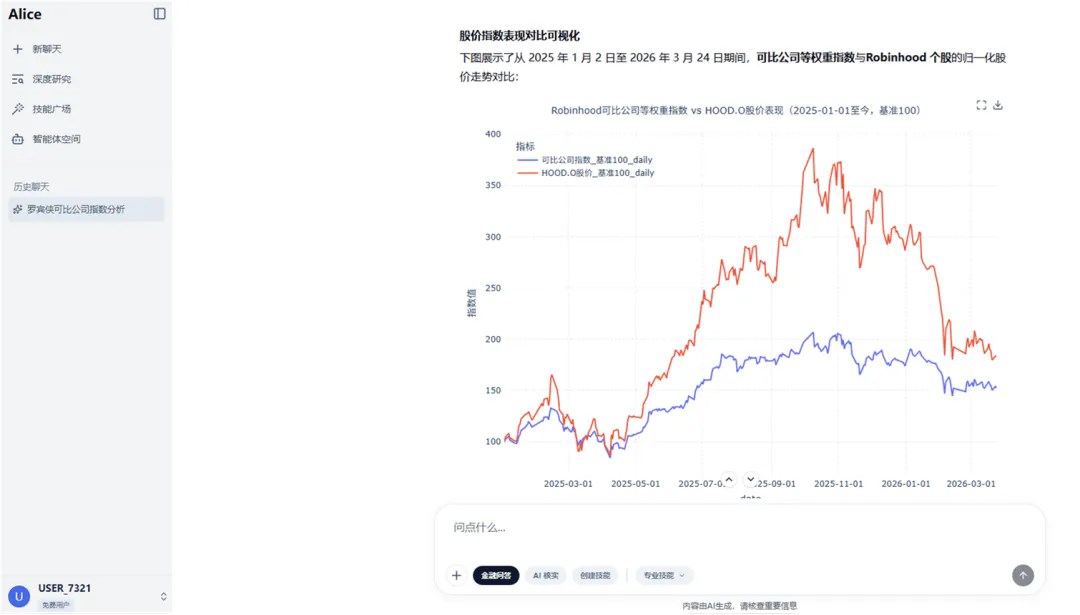 案例:“請挑選Robinhood的5家可比上市公司,做一個按等權重分配的可比公司組合股價指數,并與Robinhood自身股價表現進行對比展示。”