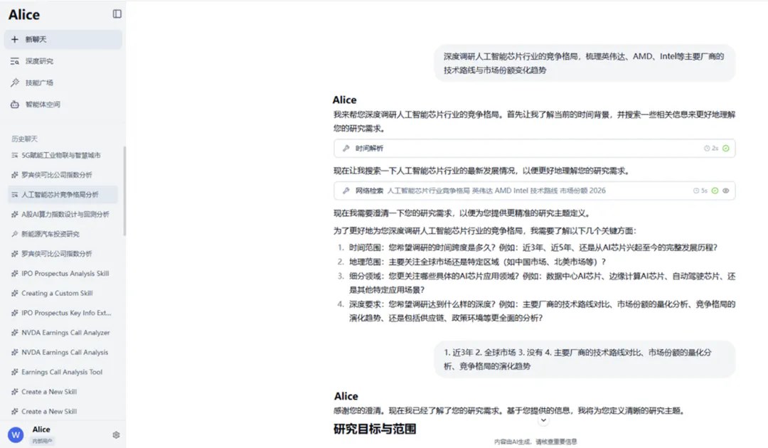 案例:“深度調研人工智能芯片行業的競爭格局,梳理英偉達、AMD、Intel等主要廠商的技術路線與市場份額變化趨勢。”