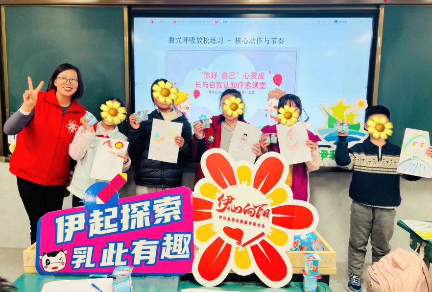 活動現場,志愿者們精心布置場地,營造輕松愉悅的學習氛圍,讓安全教育與心理關懷潤物無聲。心理健康環節,冥想引導舒緩心緒,繪畫創作解鎖心聲,互動分享凝聚溫暖,志愿者以溫和姿態傾聽孩子們的成長煩惱與美好心愿,在交流中傳遞善意與力量。活動中,志愿者代表企業贈送愛心酸奶與安全手冊,將伊利的關懷具象化,讓公益種子在孩子們心中扎根。
